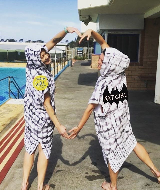 Rachel wears a Batgirl swim cap, and I wear a Supergirl one. We also have matching hoodie towels, by pure coincidence.