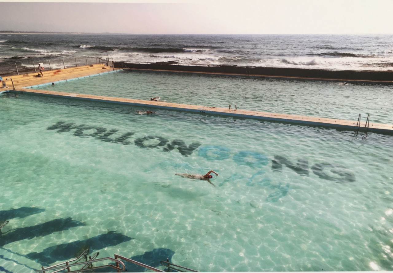 The “Press Play” banner was sunk to the bottom of the pool with sandbags by the best lifeguard in Australia, Wayne-the-Brain, as a Destination Wollongong promotional.
